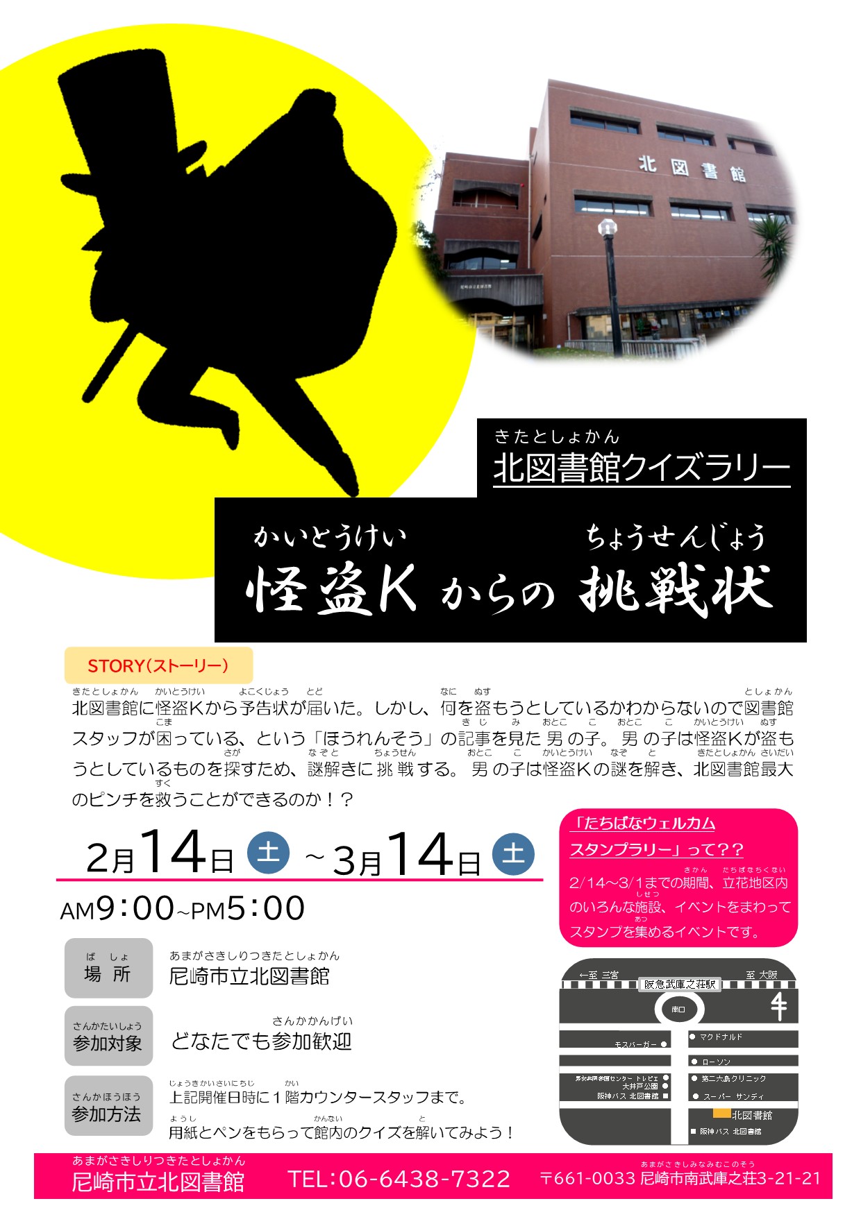 (※たちばなウェルカムスタンプラリーは、3月1日までです。【北図書館クイズラリー~怪盗Kからの挑戦状~】は、北図書館のイベントとして3月14日まで開催します。) <場所>尼崎市立北図書館 <参加対象>どなたでも <内容>クイズを解きながら館内を探検しよう! <参加方法>上記開催日時に1階カウンターのスタッフまで。 用紙とペンをもらってください。 <場所>立花南生涯学習プラザ <参加対象>子ども(保護者と一緒も可) <申込>不要(先着35名) <内容>たのしく工作しながら、自分だけのミニ絵本を作ってみよう! <協力>立花地域課 ぜひ!ご参加ください。 |